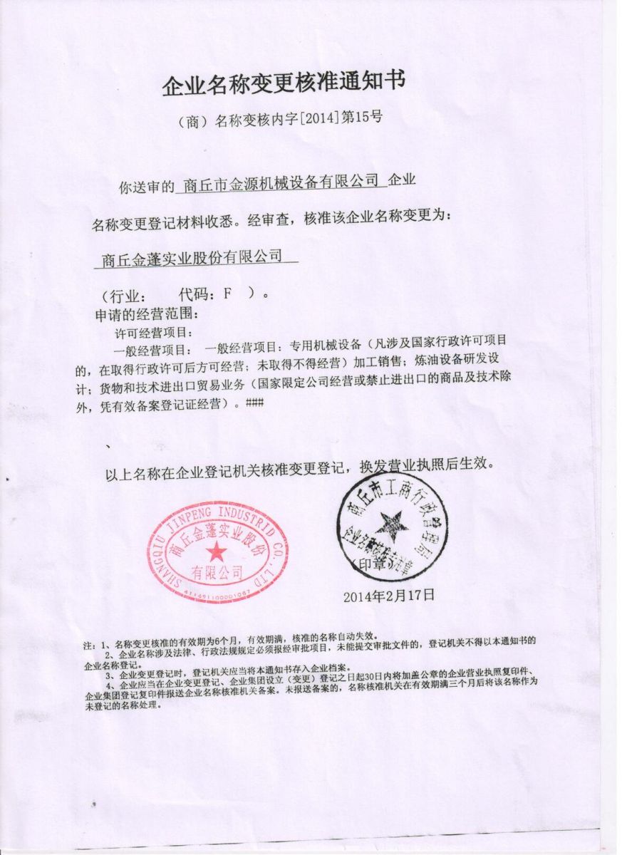 10 Mar 商丘市金源机械设备有限公司更名“江南官方体育官方入口(China)官方网站”公告 商丘金源市机械设备有限公司更名“江南官方体育官方入口(China)官方网站”公告由于股改,原商丘市金源机械设备有限公司经工商局批准,正式更名商丘金源市机械设备有限公司.