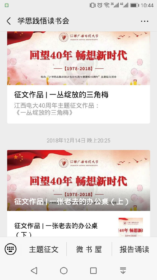与此同时,自2018年下半年至今,学校在全省电大范围内举办“回望40年,畅想新时代”主题征文、摄影比赛和书画展等活动,全省电大师生积极参与,截至目前,收到主题征文近40篇、书画作品40余幅,评选出摄影作品一、二、三等奖11幅。每篇主题征文配上相关图片,及时通过学校“学思践悟”青年读书会的微信公众号推送出来,充分挖掘与保存了一部分历史资料,也勾起了全省电大师生对过往工作、学习岁月的满满回忆,引起较大反响。