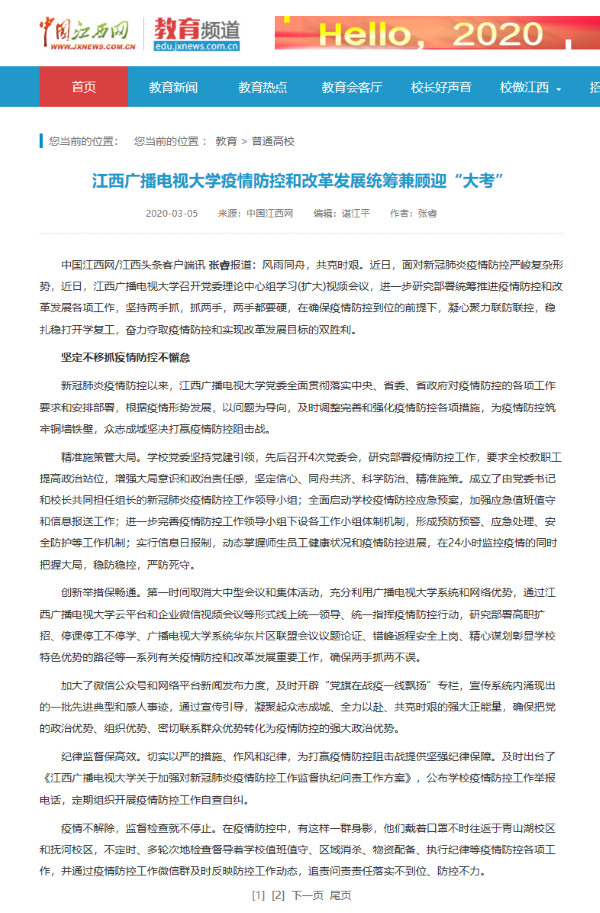 【防疫进行时·媒体聚焦】中国江西网刊载《江西广播电视大学统筹兼顾迎“大考”》