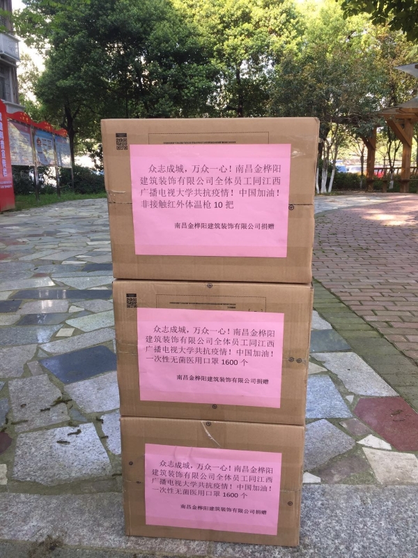 新冠肺炎疫情发生以来,学校后勤保障中心多方联系采购防疫物资,积极寻求外界支持帮助。南昌金桦阳建筑装饰有限公司急学校之所急,通过各种途径购买了1600只医用口罩和10把非接触红外体温枪捐赠给学校,以实际行动支援我校全力打赢疫情防控阻击战。