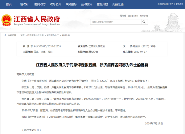 2020年7月7日,张五洲、徐济鑫两名同志在抢救和保护他人生命过程中被洪水卷走,不幸牺牲。根据《烈士褒扬条例》(2019年8月1日修订版)第八条第一款第二项规定,评定张五洲、徐济鑫两名同志为烈士。
