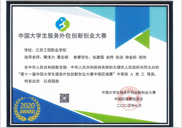 近日,从第十一届中国大学生服务外包创新创业大赛中部区域赛组委会传来喜讯,由高职学院信息工程分院黄伟力、黄志杨老师的指导下,高职学院学生张建强、余烨、张润、钟金标、胡伟组成的团队荣获中部区域赛三等奖。