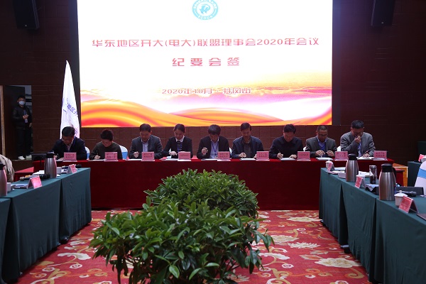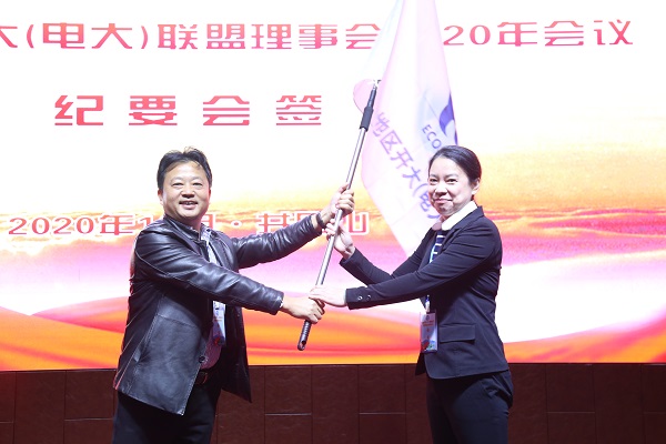 联盟理事会第二次全体会议上,联盟理事会成员单位会签《2020年理事会会议纪要》,研究确定上海开放大学为2021年理事长单位、江苏开放大学为2021年副理事长单位,与会人员共同见证了联盟理事会会旗交接仪式。