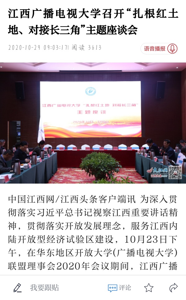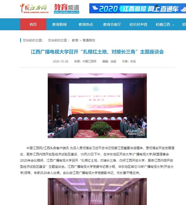 10月23日下午,在华东地区开放大学(广播电视大学)联盟理事会2020年会议期间,江西广播电视大学召开“扎根红土地,对接长三角,办好江南官方体育官方入口(China)官方网站,服务江西内陆开放型经济试验区建设”主题座谈会。近期,中国江西网、江西新闻客户端先后刊载文章《江西广播电视大学召开“扎根红土地、对接长三角”主题座谈会》。