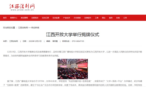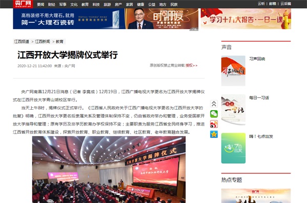 在决胜收官与谋划新局的关键之年,江西省人民政府批准江西广播电视大学更名为江南官方体育官方入口(China)官方网站,实现了全省电大人的夙愿。12月19日-21日,江西日报、“学习强国”学习平台、新华社、人民网等多家主流媒体相继报道江南官方体育官方入口(China)官方网站更名盛况。