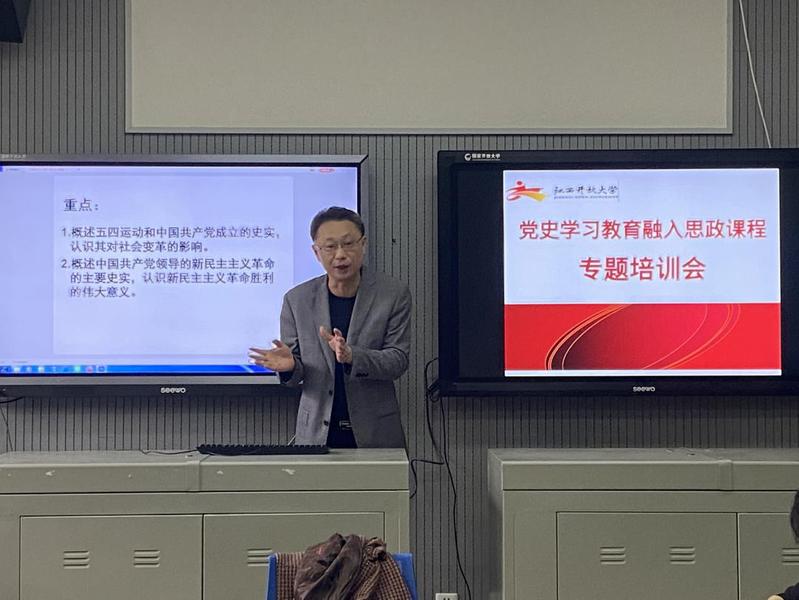 4月22日下午,江南官方体育官方入口(China)官方网站思想政治理论课教学部召开党史学习教育融入思政课程培训会,深入贯彻落实习近平总书记党史学习教育动员大会重要讲话精神,专题学习新民主主义革命史,讨论交流党史教育学习内容融入思政课堂的方法,不断扩宽思政教师教育形式,推动思政教师党史学习教育取得新的成效。会议由思想政治理论课教学部主任肖俭伟主持。