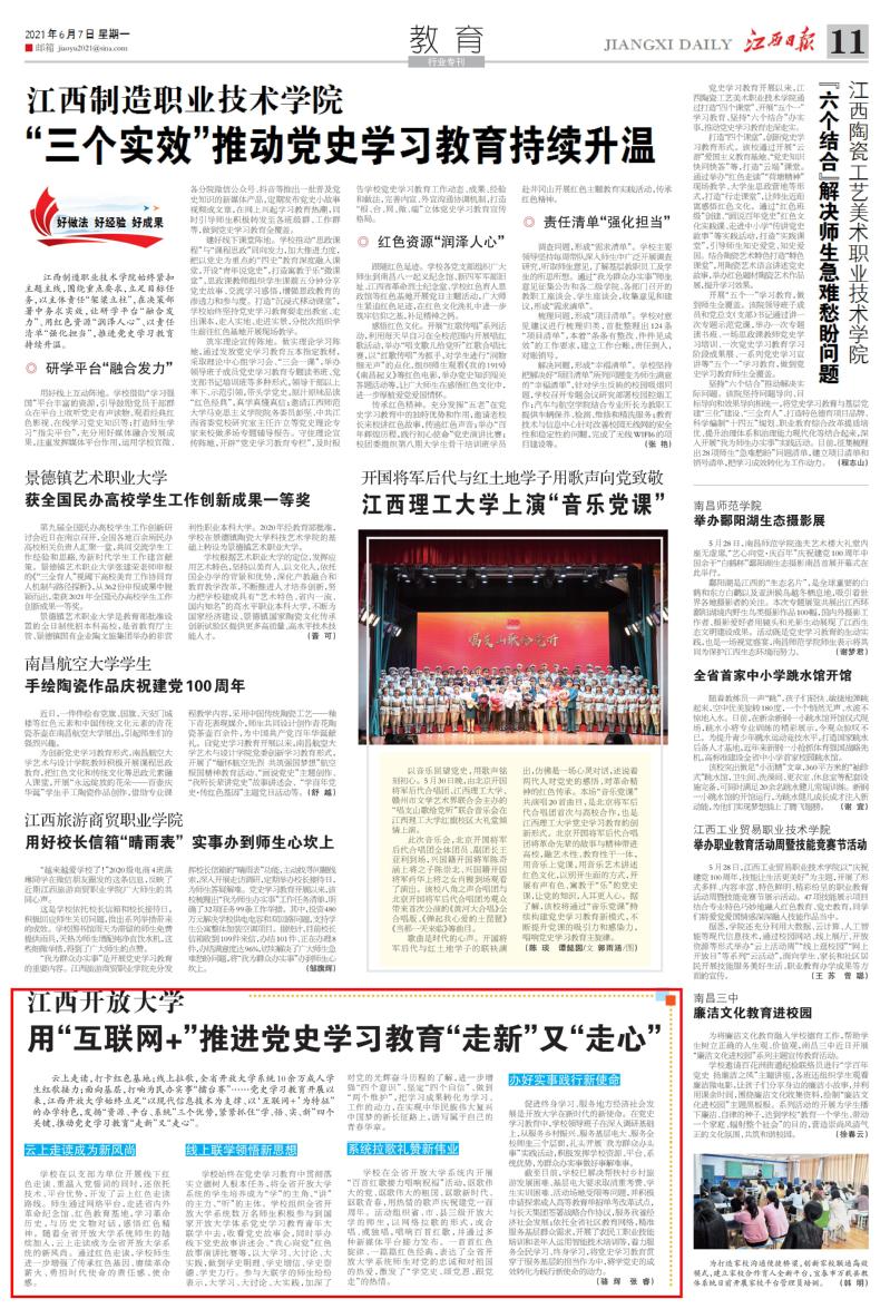 党史学习教育开展以来,学校充分发挥“互联网+”特色,紧紧抓住“学、悟、实、新”四个关键,推动党史学习教育“走新”又“走心”。6月7日,江西日报、学习强国、江西新闻等媒体相继对此进行报道。