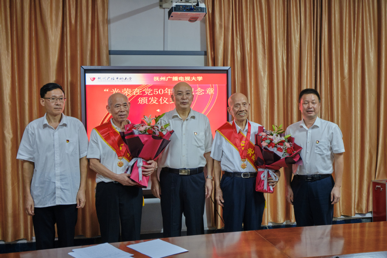 五十年党龄,五十年荣光。谢晓宇宣读了学校“光荣在党50年”纪念章获得者名单,并转达了抚州市委常委、市委宣传部部长肖承贵对获得“光荣在党50年”纪念章老党员的热烈祝贺和崇高敬意。谢晓宇同志为纪念章获得者代表颁发了“光荣在党50年”纪念章,并一一为他们披上绶带,送上鲜花。
