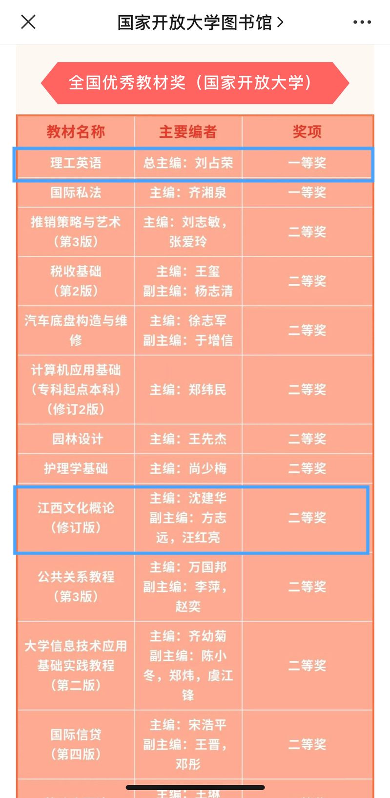 由国家开放大学刘占荣教师主编的《理工英语》(1-4册)教材荣获“全国优秀教材一等奖”,其中,《理工英语Ⅰ》主要由我校英语老师编写完成,胡江萍教授担任该册副主编。沈建华主编、方志远、汪红亮副主编的《江西文化概论》(中央广播电视大学出版社2014年版)荣获“全国优秀教材二等奖”。