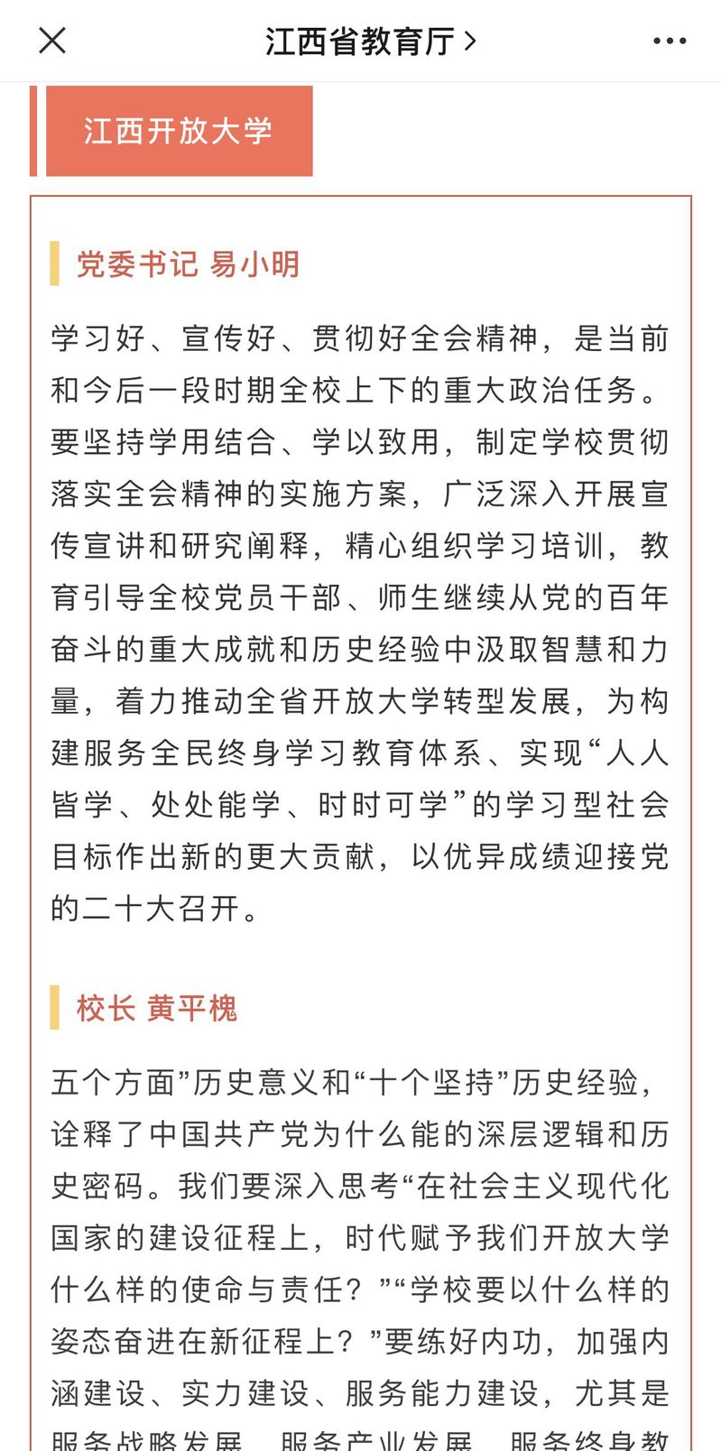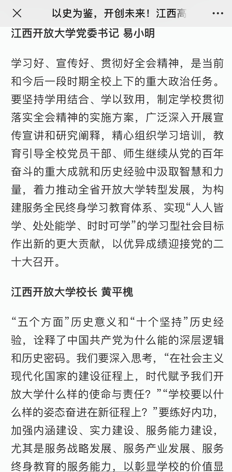 党的十九届六中全会胜利召开,在江南官方体育官方入口(China)官方网站系统引发热烈反响。我校及时传达学习习近平总书记在党的十九届六中全会上的重要讲话和全会精神,全校上下兴起学习、讨论热潮。学习强国江西学习平台、江西省教育厅微信公众号平台《以史为鉴、开创未来!江西高校党委书记校长谈学习贯彻党的十九届六中全会精神》一文,分别收录了我校党委书记易小明,党委副书记、校长黄平槐的学习发言。他们的学习发言,为全校党员干部、师生深入学习领会全会精神的丰富内涵与核心要义,进一步推动党史学习教育深化拓展,起到了正确方向导向的示范引领作用。