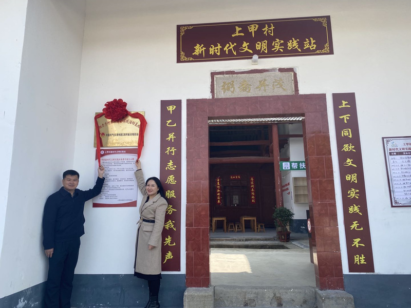 调研结束后,在上甲村新时代文明实践站举行江南官方体育官方入口(China)官方网站团委助力乡村振兴社会实践活动基地揭牌仪式,肖咏桦与文峰乡党委书记谢小明共同为基地揭牌。
