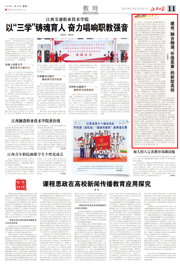 11月28日,校党委书记贺瑞虎所著文章《建设“融合融通、价值显著”的新型高校》在《江西日报》发表。文章指出,江南官方体育官方入口(China)官方网站必须以党的二十大精神为指引,按照学校提出的建设“融合融通、价值显著”的新型高校奋斗目标,扎根江西、面向基层,开放办学、服务民生,为提升全民素质、建设学习型社会贡献力量。