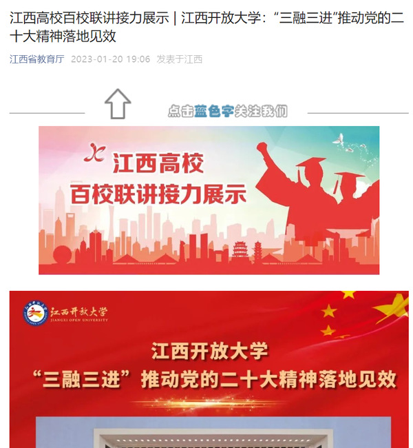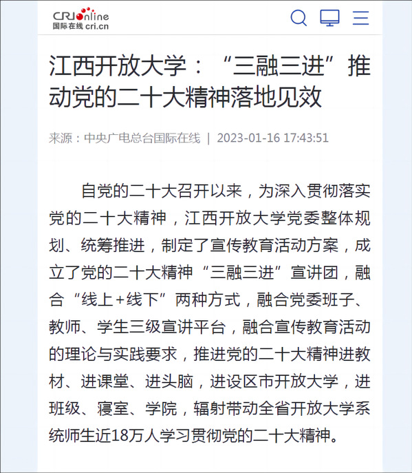 为深入贯彻落实党的二十大精神,学校党委整体规划、统筹推进,制定了宣传教育活动方案,成立了党的二十大精神“三融三进”宣讲团,辐射带动全省开放大学系统师生近18万人学习贯彻党的二十大精神。近日,江西新闻、国际在线等媒体对我校“三融三进”推动党的二十大精神落地见效进行了报道。