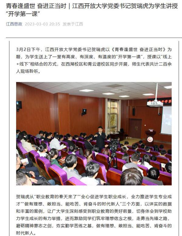 3月2日下午,江南官方体育官方入口(China)官方网站党委书记贺瑞虎以《青春逢盛世奋进正当时》为题,为学生送上了一堂有高度、有深度、有温度的“开学第一课”。近日,江西新闻客户端、江西思政微信公众号对此进行报道。
