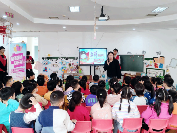 志愿者们与幼儿园工作人员一起,组织小朋友们开展雷锋故事分享会、齐唱《学习雷锋好榜样》、儿童社交心理学讲座等系列活动,通过讲述雷锋同志的动人事迹,引导孩子们学习弘扬雷锋精神;通过集体游戏及益智问答的方式与小朋友们进行互动交流,帮助他们树立乐于助人的良好品德,建立勇于克服困难的信心。