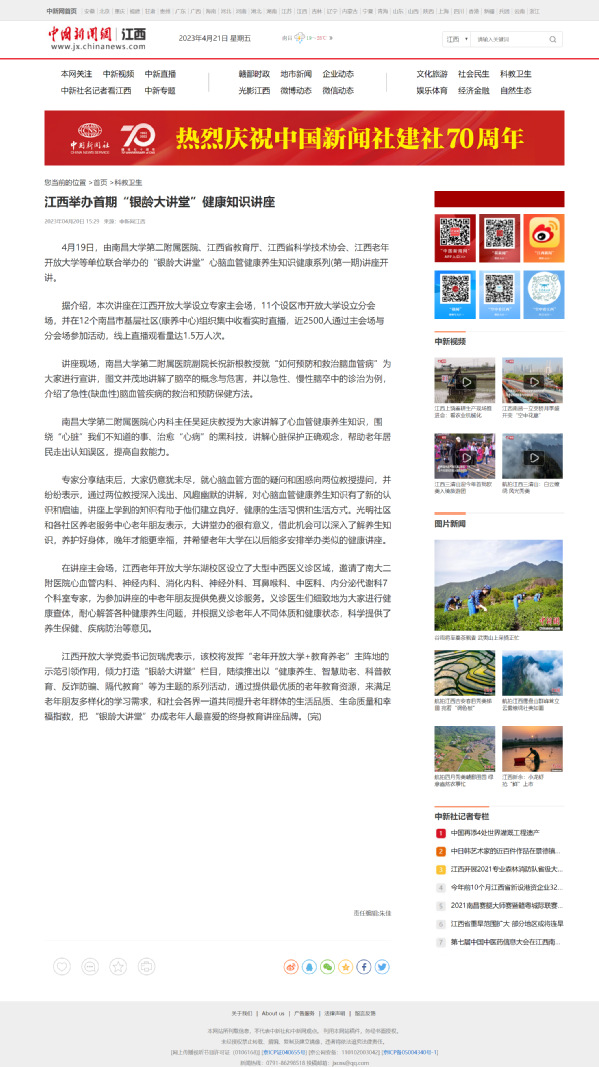 419日,由南昌大学第二附属医院、江西省教育厅、江西省科学技术协会、江西老年开放大学等单位联合举办的“银龄大讲堂”心脑血管健康养生知识健康系列(第一期)讲座开讲。