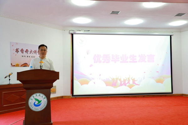 优秀毕业生王会占代表毕业生发言,他感谢党和国家的政策,深情告白母校,并满怀真诚地回顾了三年求学时光,学校及辛勤工作无私奉献的老师们致深深谢意。