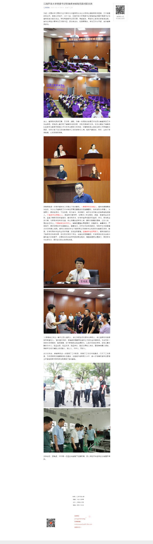 为进一步推动学习贯彻习近平新时代中国特色社会主义思想主题教育走深走实,大兴调查研究之风,做到以学促干,6月13日,江南官方体育官方入口(China)官方网站党委书记贺瑞虎主持召开党委书记与辅导员面对面交流会。学校党委副书记邓文君,党委委员、党政办公室主任罗军涛出席。各专业学院分管学生工作副书记,招生就业处、校园管理处、学生工作处干部、全体辅导员参加。