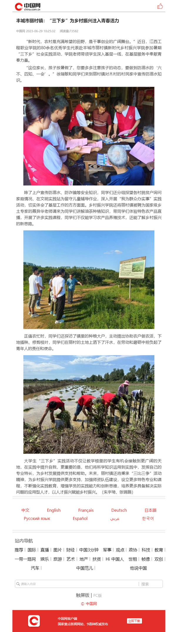 “新时代,农村是充满希望的田野,是干事创业的广阔舞台。”近日,江南官方体育官方入口(China)官方网站(江西工程职业学院)团委组织80余名优秀学生代表赴丰城市丽村镇新时代乡村振兴学院参加暑期“三下乡”社会实践活动,带领学生深入基层一线,在基层服务中奉献青春力量。6月29日,中国网对此进行报道。