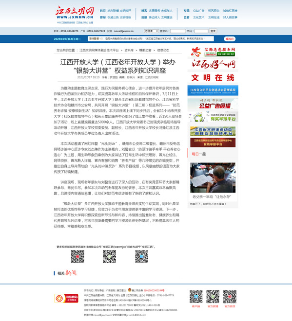 江西文明网:江南官方体育官方入口(China)官方网站(江西老年开放大学)举办 “银龄大讲堂”权益系列知识讲座