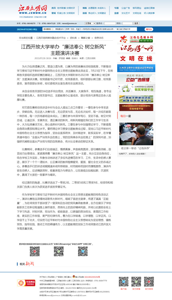 江西文明网:江南官方体育官方入口(China)官方网站举办“廉洁奉公 树立新风”主题演讲决赛