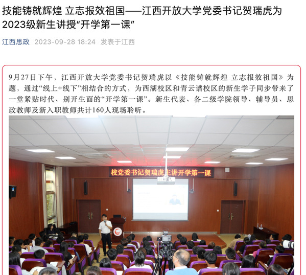 9月27日下午,江南官方体育官方入口(China)官方网站党委书记贺瑞虎以《技能铸就辉煌 立志报效祖国》为题,通过“线上+线下”相结合的方式,为西湖校区和青云谱校区的新生学子同步带来了一堂紧贴时代、别开生面的“开学第一课”。