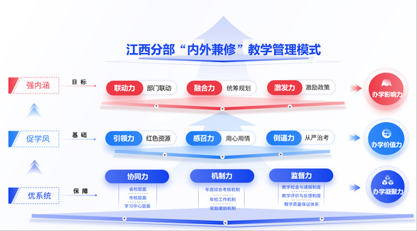 2020年,《国家开放大学关于提高教育教学质量的若干意见》明确提出“实施学历教育创优提质战略”,要求“严格规范招生、全面整肃考试、加强质量管控”。如何实现创优提质?江南官方体育官方入口(China)官方网站《“十四五”发展规划及二〇三五远景目标》提出“坚持内涵发展,加强教学基本建设,全面深化质量提升综合治理工程”。江南官方体育官方入口(China)官方网站2022年第一次党代会提出“整合职业教育优质师资、课程、平台等资源,聚焦学科、专业、课程建设关键能力,高效赋能开放教育内涵式发展”。学校在教学管理过程中探索形成了内、外力相作用的“内外兼修”教学管理模式,学风、内涵、系统三大建设取得明显成效。