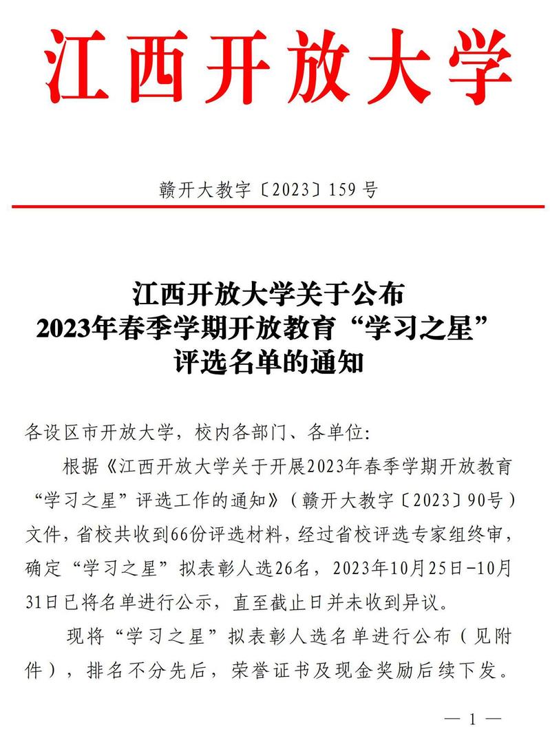 近日,学校公布了2023年春季学期开放教育“学习之星”人员名单,26位同学获选。