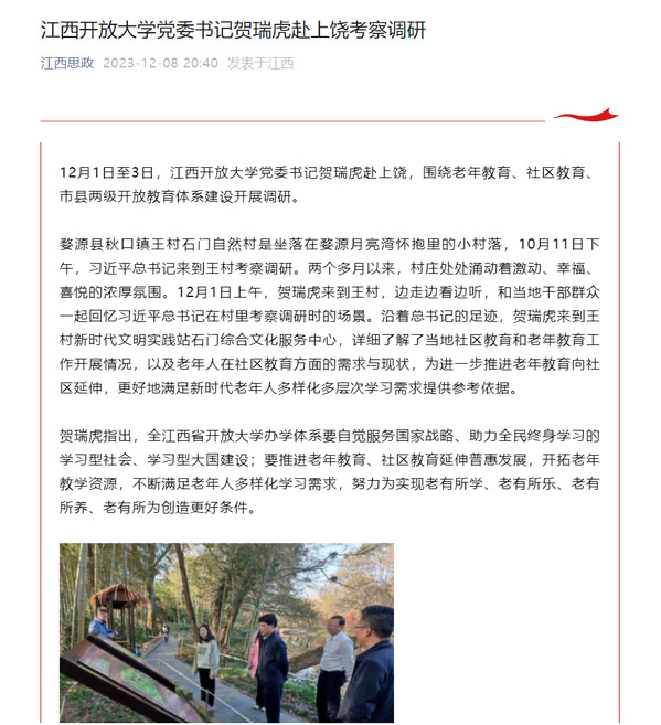 12月1日至3日,江南官方体育官方入口(China)官方网站党委书记贺瑞虎赴上饶,围绕老年教育、社区教育、市县两级开放教育体系建设开展调研。