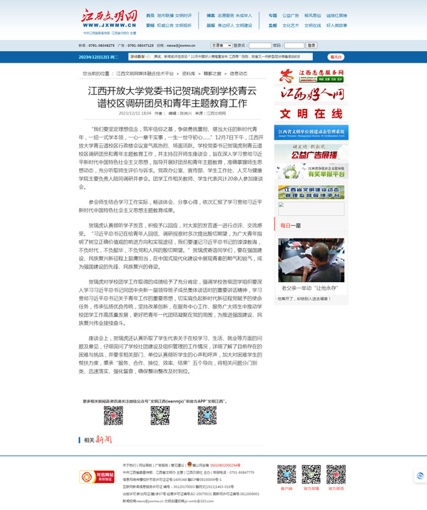 江西文明网:江南官方体育官方入口(China)官方网站党委书记贺瑞虎到学校青云谱校区调研团员和青年主题教育工作