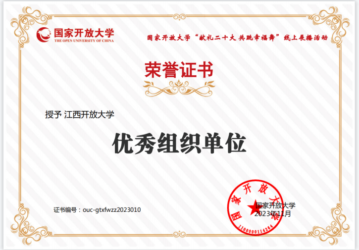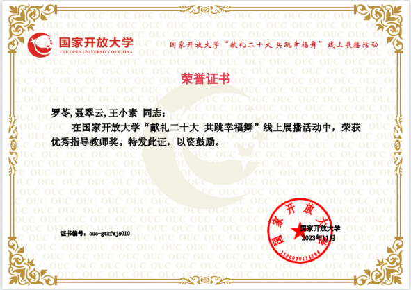 近日,国家开放大学公布了“献礼二十大 共跳幸福舞”“献礼二十大 同唱欢乐歌”活动优秀组织单位和优秀指导教师评选结果,学校报送的作品在活动中获得佳绩。