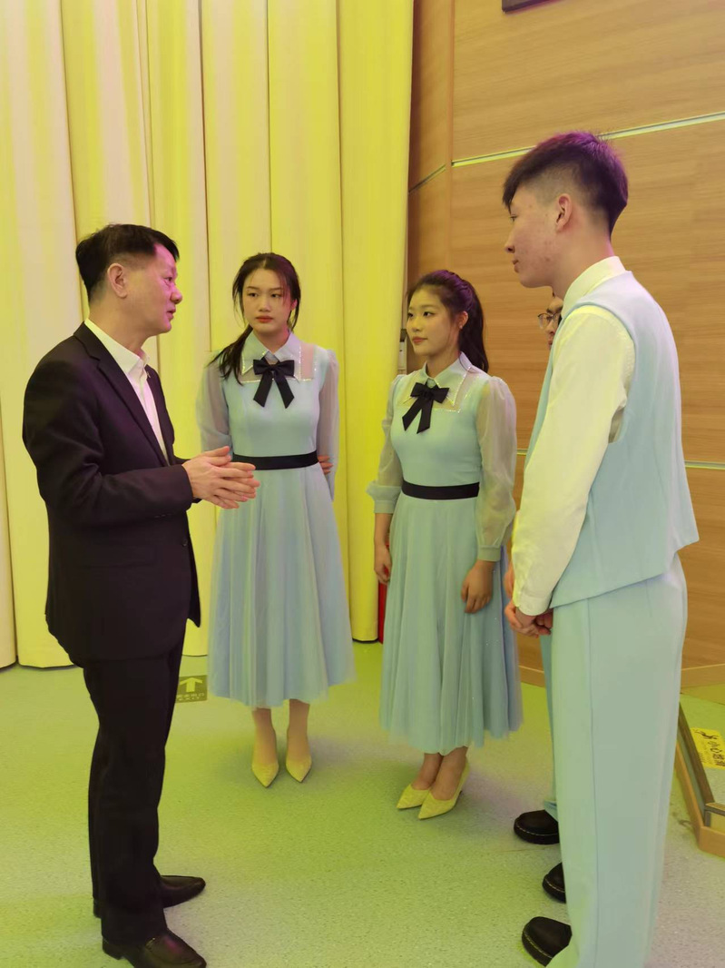 “你今天的表现比上次好多了!”“你的动作做得还不够到位,要有力量,情感要更丰富”“联唱合唱一定要注意动作协调、位置的准确”“注意面部表情”……邓文君非常关注参演人员的舞台表现,指导师生努力展现出最真实的情感和最青春的风貌。