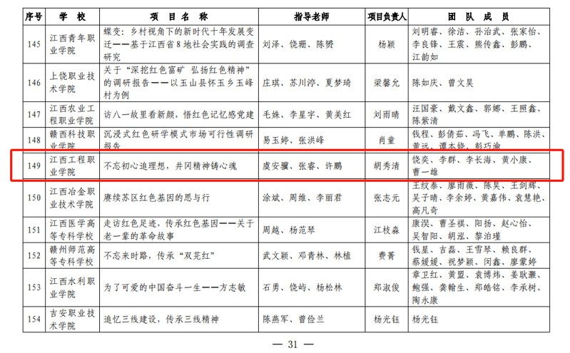 近日,第十八届“挑战杯”江西省大学生课外学术科技作品竞赛圆满闭幕。学校参赛作品《不忘初心追理想,井冈精神铸心魂》荣获红色专项活动三等奖。