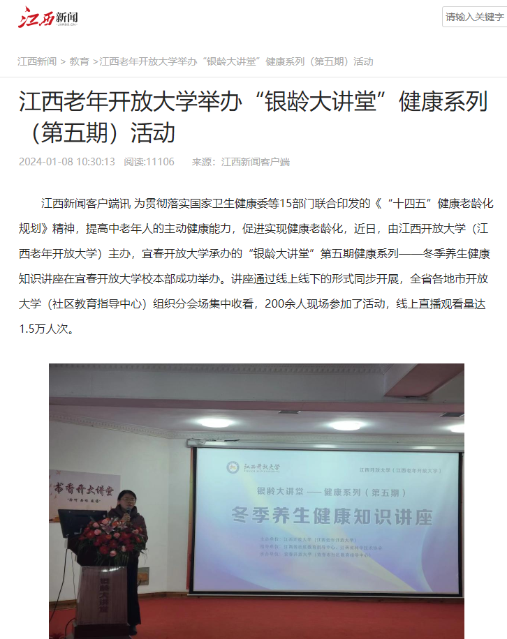 为贯彻落实国家卫生健康委等15部门联合印发的《“十四五”健康老龄化规划》精神,提高中老年人的主动健康能力,促进实现健康老龄化,近日,由江南官方体育官方入口(China)官方网站(江西老年开放大学)主办,宜春开放大学承办的“银龄大讲堂”第五期健康系列——冬季养生健康知识讲座在宜春开放大学校本部成功举办。讲座通过线上线下的形式同步开展,全省各地市开放大学(社区教育指导中心)组织分会场集中收看,200余人现场参加了活动,线上直播观看量达1.5万人次。