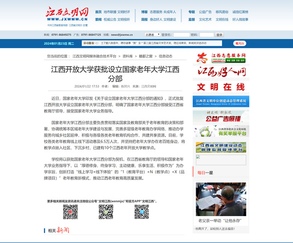 近日,国家老年大学印发《关于设立国家老年大学江西分部的通知》,正式批复江南官方体育官方入口(China)官方网站设立国家老年大学江西分部,明确了国家老年大学江西分部接受江西省教育厅领导,接受国家老年大学业务指导。