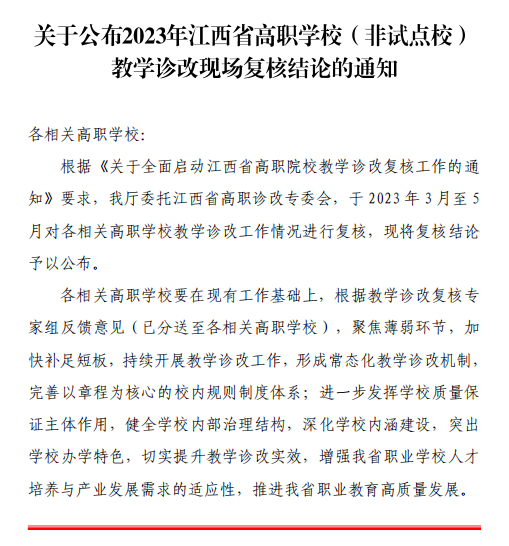 近日,江西省教育厅印发《关于公布2023年江西省高职学校(非试点校)教学诊改现场复核结论的通知》,学校顺利通过高职学校(非试点校)教学诊改现场复核。此前,我校于2022年7月通过网上复核,2023年3月20日-22日开展现场复核。