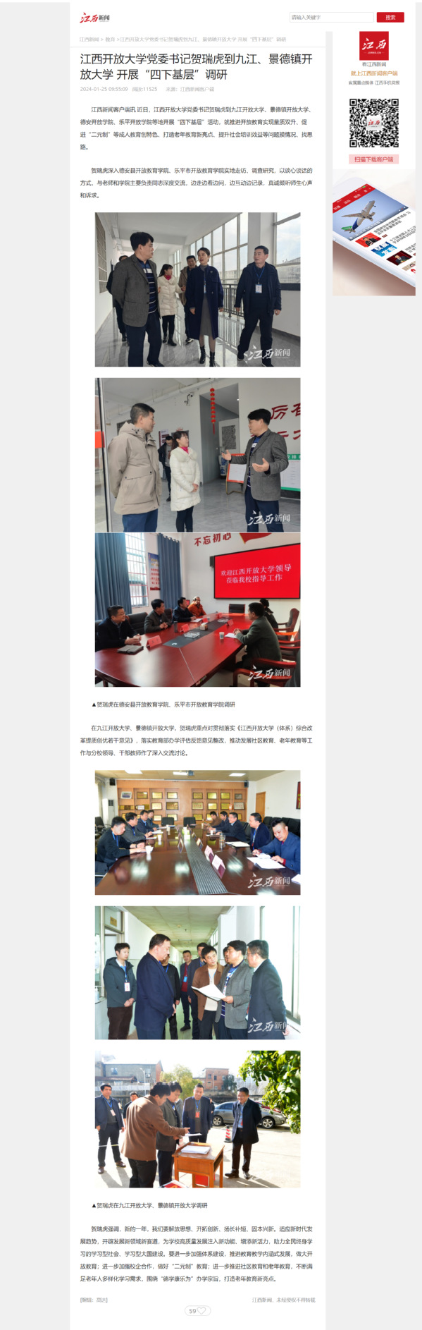 近日,江南官方体育官方入口(China)官方网站党委书记贺瑞虎到九江开放大学、景德镇开放大学、德安开放学院、乐平开放学院等地开展“四下基层”活动,就推进开放教育实现量质双升、促进“二元制”等成人教育创特色、打造老年教育新亮点、提升社会培训效益等问题摸情况、找思路。