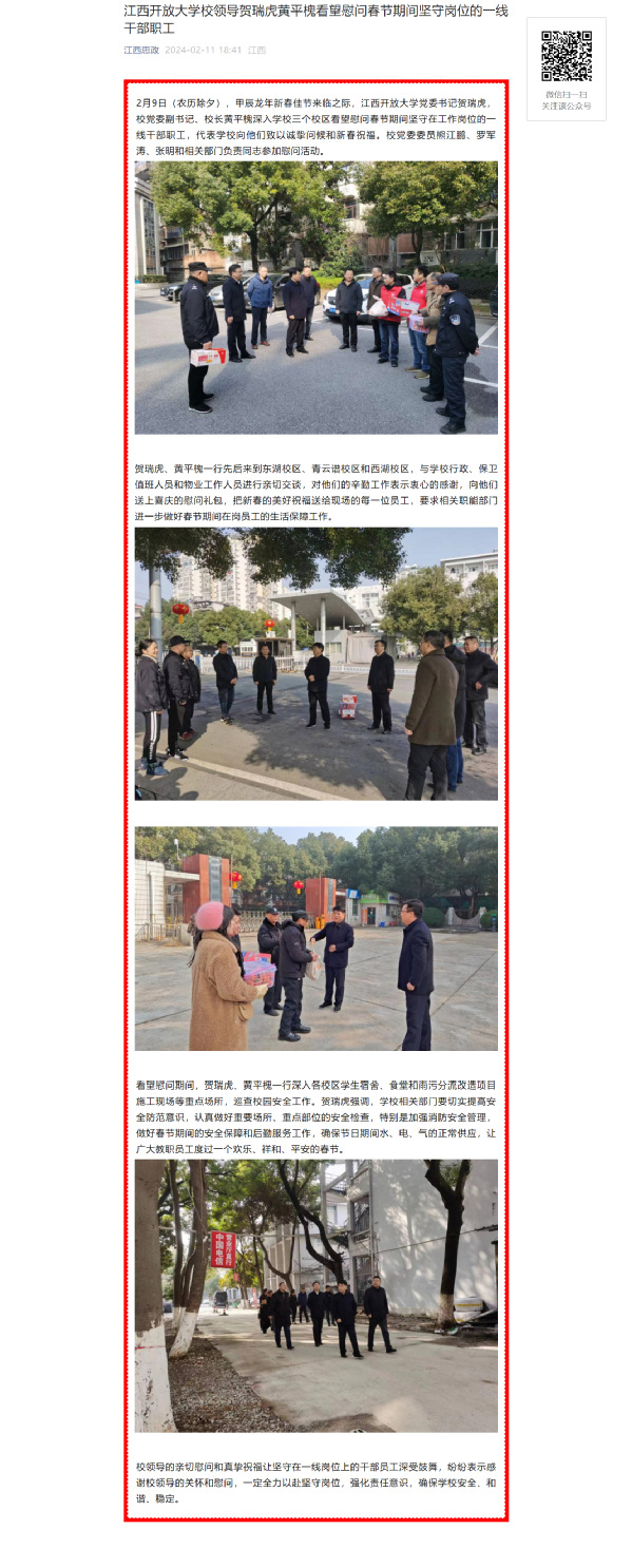 2月9日(农历除夕),甲辰龙年新春佳节来临之际,江南官方体育官方入口(China)官方网站党委书记贺瑞虎,校党委副书记、校长黄平槐深入学校三个校区看望慰问春节期间坚守在工作岗位的一线干部职工,代表学校向他们致以诚挚问候和新春祝福。校党委委员熊江鹏、罗军涛、张明和相关部门负责同志参加慰问活动。