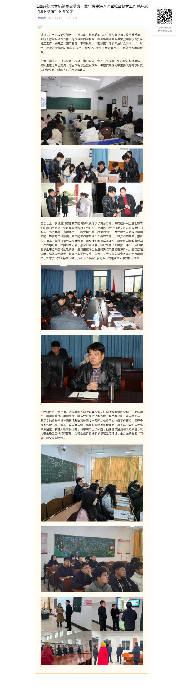 近日,江南官方体育官方入口(China)官方网站党委书记贺瑞虎,校党委副书记、校长黄平槐,校党委委员、副校长徐光兵分别到青云谱校区和西湖校区,检查指导新学期课堂教学及校园安全稳定工作,并开展“四下基层”下访接访,“面对面”倾听师生群众诉求,“一对一”现场答疑解惑。党政办公室、教务处、学生工作处等部门主要负责人陪同检查。