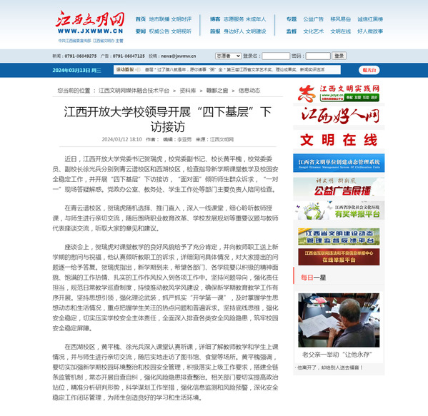 近日,江南官方体育官方入口(China)官方网站党委书记贺瑞虎,校党委副书记、校长黄平槐,校党委委员、副校长徐光兵分别到青云谱校区和西湖校区,检查指导新学期课堂教学及校园安全稳定工作,并开展“四下基层”下访接访,“面对面”倾听师生群众诉求,“一对一”现场答疑解惑。党政办公室、教务处、学生工作处等部门主要负责人陪同检查。