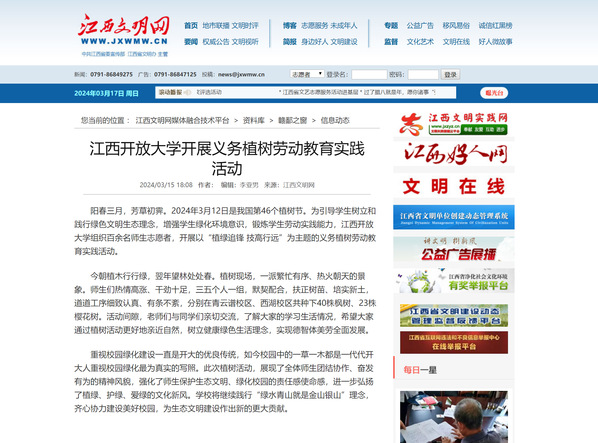 阳春三月,芳草初霁。2024年3月12日是我国第46个植树节。为引导学生树立和践行绿色文明生态理念,增强学生绿化环境意识,锻炼学生劳动实践能力,江南官方体育官方入口(China)官方网站组织百余名师生志愿者,开展以“植绿追锋 技高行远”为主题的义务植树劳动教育实践活动。