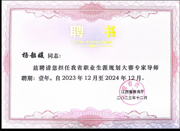 近日,江西省教育厅公布了第三届江西省“互联网+”大学生创新创业大赛暨首届职业生涯规划大赛指导教师技能培训及展示活动获奖名单,学校数字经济学院教师杨韶媛经过技能培训考核,初赛、复赛等环节,在全省本(专)科高校推荐选送的160余位参赛教师中脱颖而出,获得二等奖,并受聘担任江西省职业生涯规划大赛专家导师。