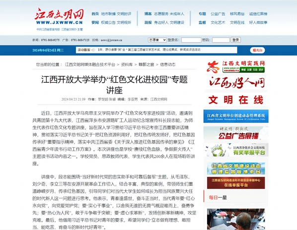 近日,江南官方体育官方入口(China)官方网站马克思主义学院举办了“红色文化专家进校园”活动,邀请到共青团第十九大代表、江西省萍乡市安源路矿工人运动纪念馆宣传科长段志能,为师生代表作红色文化专题讲座。