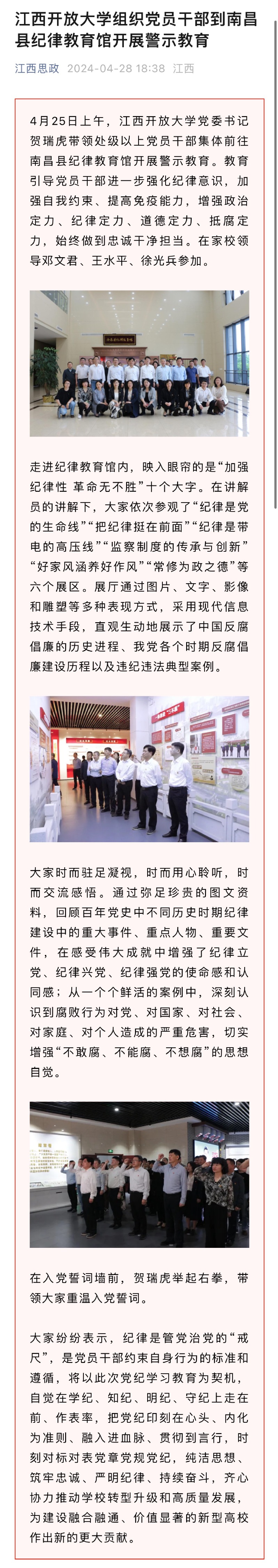 4月25日上午,江南官方体育官方入口(China)官方网站党委书记贺瑞虎带领处级以上党员干部集体前往南昌县纪律教育馆开展警示教育。教育引导党员干部进一步强化纪律意识,加强自我约束、提高免疫能力,增强政治定力、纪律定力、道德定力、抵腐定力,始终做到忠诚干净担当。在家校领导邓文君、王水平、徐光兵参加。