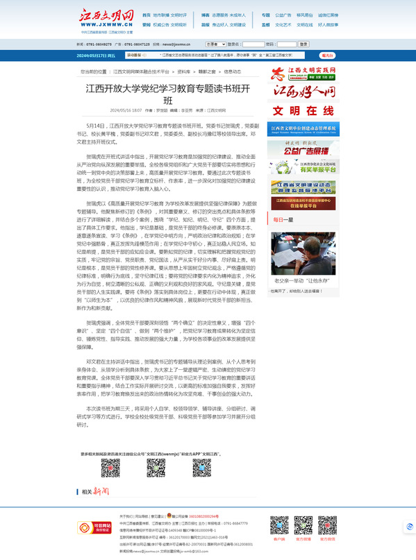 5月14日,江南官方体育官方入口(China)官方网站党纪学习教育专题读书班开班。党委书记贺瑞虎,党委副书记、校长黄平槐,党委副书记邓文君,党委委员、副校长冯豫红等校领导出席。邓文君主持开班仪式。