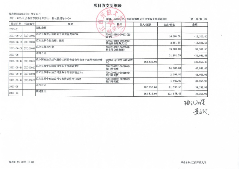 社会教育学院于2023年承接了中国石油江西销售分公司党务干部培训项目并顺利完成培训。依据《教育部、江西省人民政府关于整省推进职业教育综合改革提质创优的意见》(赣府发〔2020〕16 号),以及学校《江南官方体育官方入口(China)官方网站非学历教育管理办法(试行)》等文件精神将培训净收入的60%共计23550元用于增加一次性绩效工资总量。