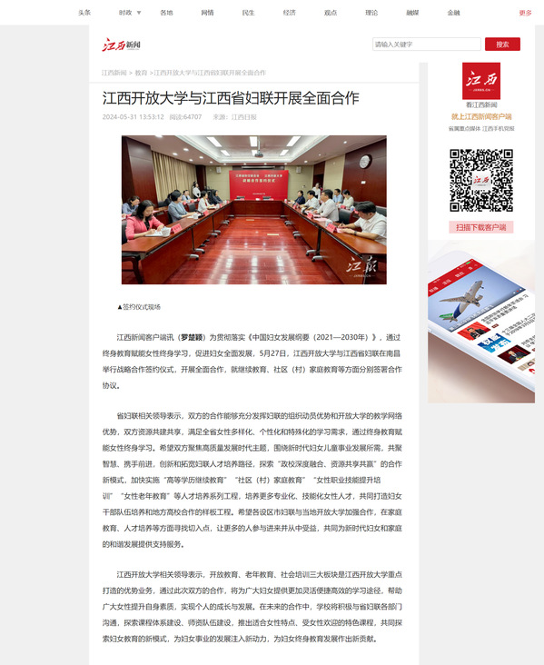 为贯彻落实《中国妇女发展纲要(2021—2030年)》,通过终身教育赋能女性终身学习,促进妇女全面发展,5月27日,江南官方体育官方入口(China)官方网站与江西省妇联在南昌举行战略合作签约仪式,开展全面合作,就继续教育、社区(村)家庭教育等方面分别签署合作协议。