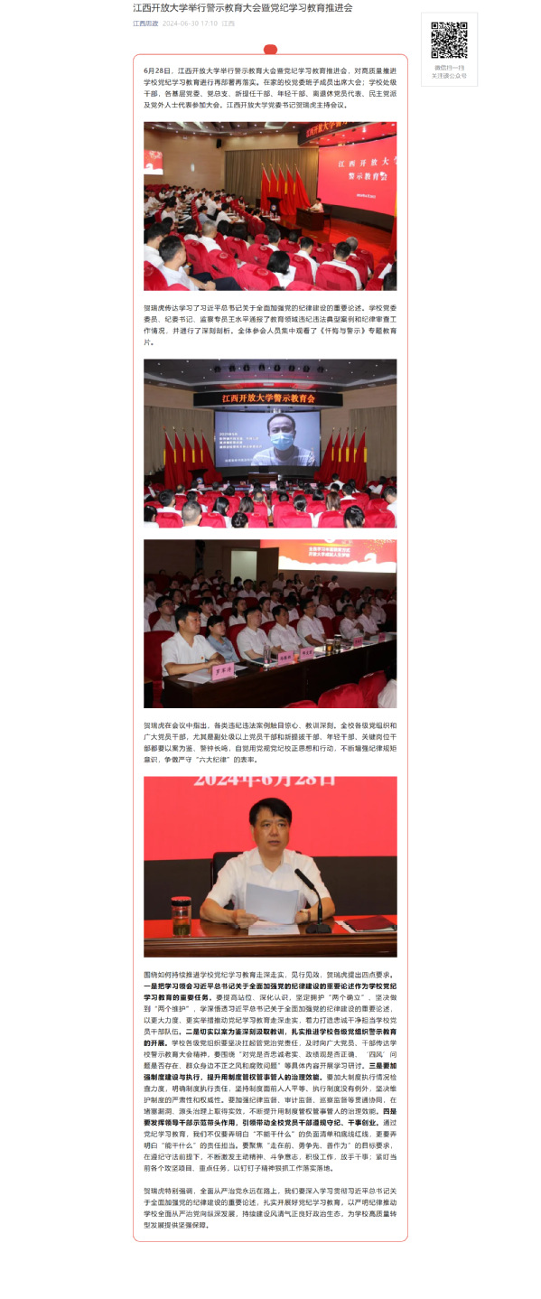 6月28日,江南官方体育官方入口(China)官方网站举行警示教育大会暨党纪学习教育推进会,对高质量推进学校党纪学习教育进行再部署再落实。在家的校党委班子成员出席大会;学校处级干部,各基层党委、党总支、新提任干部、年轻干部、离退休党员代表、民主党派及党外人士代表参加大会。江南官方体育官方入口(China)官方网站党委书记贺瑞虎主持会议。