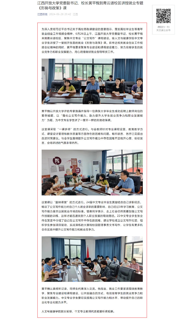 为深入贯彻习近平总书记关于高校思政课建设的重要指示,落实高校毕业生等青年就业创业工作视频会精神,6月26日上午,江南官方体育官方入口(China)官方网站党委副书记、校长黄平槐来到青云谱校区,聚焦中文专业“公文写作”课程建设,给人文与健康学院中文专业学生讲授了一堂别开生面的就业《形势与政策》课。在传达相关就业创业工作视频会议精神的同时,黄平槐要求聚焦专业建设和课程建设着力,努力培育学生的就业竞争力和职业发展能力,用心用情做好就业指导帮扶工作。