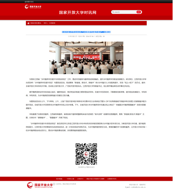 为落实江西省“乡村教师学历提升专项培训项目”工作,推进学历教育与教师培训深度融合,提升乡村教师学员职业发展能力,6月29日,江南官方体育官方入口(China)官方网站举办2024年“乡村教师学历提升项目”专题培训活动。培训聚焦“新视域、新技术,新教学”助力乡村振兴人才技能再提升,采用“线上+线下”的方式,面向全省开放大学体系同步开展。活动由上饶开放大学、广信区开放学院协办。江南官方体育官方入口(China)官方网站党委副书记、校长黄平槐出席活动开幕式并讲话。